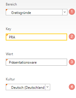 Der gewünschte Bereich wird aus der Liste ausgewählt (1). Anschließend wird der Key (2) festgelegt, der im ERP System weiterverwendet wird. Im Client wird stattdessen der Wert (3) angezeigt. Anschließen wird die Kultur (4) gewählt, damit die Anzeige im Client in der richtigen Sprache angezeigt wird.
