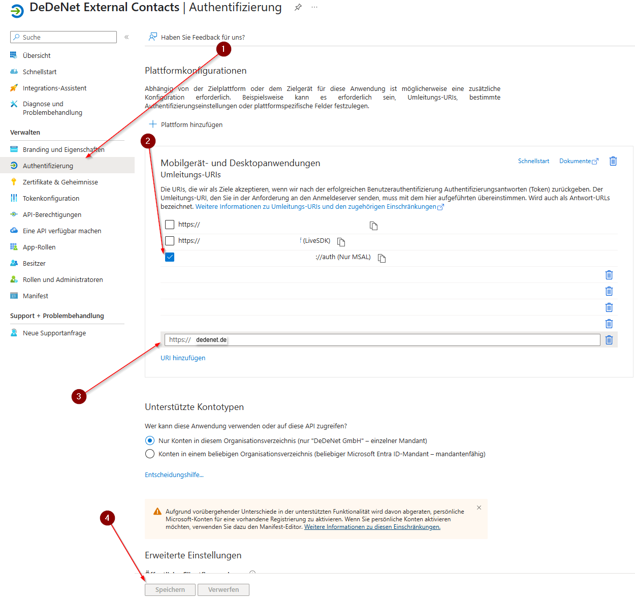 Unterstützte Kontotypen: Nur Konten in diesem Organisationsverzeichnis (nur "DeDeNet GmbH" – einzelner Mandant) auswählen.